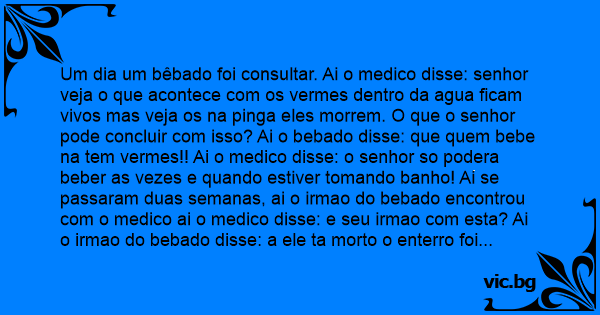Um dia um bêbado foi consultar. Ai o medico disse: senhor veja o que acontece com os vermes dentro da agua ficam vivos mas veja os na pinga eles morrem. O que o senhor pode concluir com isso? Ai o bebado disse: que quem bebe na tem vermes!! Ai o medico disse: o senhor so podera beber as vezes e quando estiver tomando banho! Ai se passaram duas semanas, ai o irmao do bebado encontrou com o medico ai o medico disse: e seu irmao com esta? Ai o irmao do bebado disse: a ele ta morto o enterro foi domingo. Ai o medico disse: Mais pq? Ai o irmao do bebado disse: A e pq depois que ele voltou da sua consulta ele tomava banho de 2 em 2 minutos