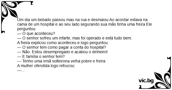 Um dia um bebado passou mau na rua e desmaiou Ao acordar estava na cama de um hospital e ao seu lado segurando sua mão tinha uma freira Ele perguntou: