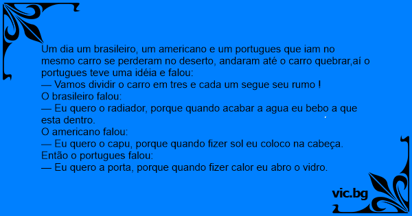 Um dia um brasileiro, um americano e um portugues que iam no mesmo carro se perderam no deserto, andaram até o carro quebrar,aí o portugues teve uma idéia e falou: