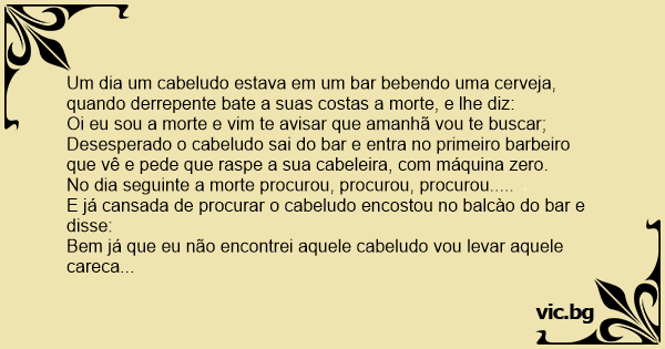 Um dia um cabeludo estava em um bar bebendo uma cerveja, quando derrepente bate a suas costas a morte, e lhe diz: