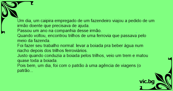 Pois bem, um dia, foi com o patrão à uma agência de viagens (o patrão ia viajar)e lá ele depara com uma miniatura de um trem: Quebrou o trem todinho.-o que é que você pensa que está fazendo? perguntou o patrão! E ele respondeu: patrão, foi uma criatura como essa que matou sua boiada. Temo que matar quando é pequeno, pois quando cresce é aquele arraso uai.