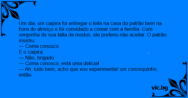 Um dia, um caipira foi entregar o leite na casa do patrão bem na hоrа do almoço e foi convidado a comer com a família. Com vergonha de sua falta de modos, ele preferiu não aceitar. O patrão insistiu: