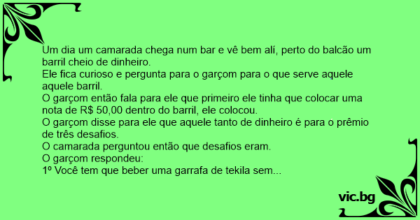 Um dia um camarada chega num bar e vê bem alí, perto do balcão um barril cheio de dinheiro.