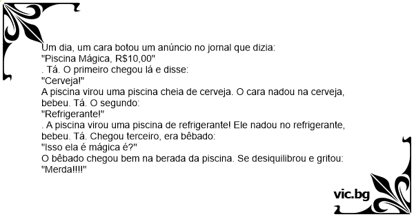 A piscina virou uma piscina cheia de cerveja. O cara nadou na cerveja, bebeu. Tá. O segundo: