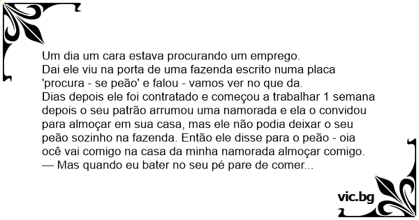 Dias depois ele foi contratado e começou a trabalhar 1 semana depois o seu patrão arrumou uma namorada e ela o convidou para almoçar em sua casa, mas ele não podia deixar o seu peão sozinho na fazenda. Então ele disse para o peão - oia ocê vai comigo na casa da minha namorada almoçar comigo.
