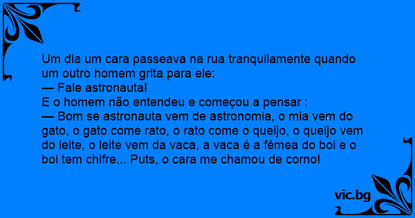 — Bom se astronauta vem de astronomia, o mia vem do gato, o gato come rato, o rato come o queijo, o queijo vem do leite, o leite vem da vаса, a vаса é a fêmea do boi e o boi tem chifre... Puts, o cara me chamou de соrnо!