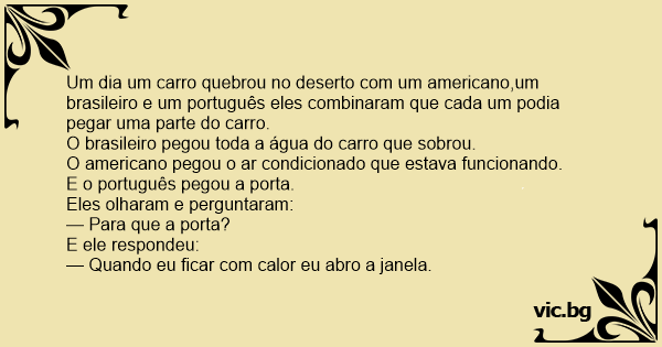 Um dia um carro quebrou no deserto com um americano,um brasileiro e um português eles combinaram que cada um podia pegar uma parte do carro.