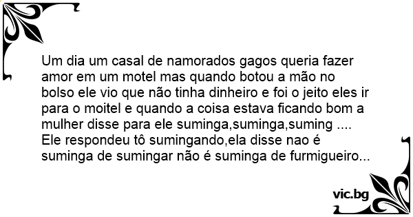 Um dia um casal de namorados gagos queria fazer amor em um motel mas quando botou a mão no bolso ele vio que não tinha dinheiro e foi o jeito eles ir para o moitel e quando a coisa estava ficando bom a mulher disse para ele suminga,suminga,suming ....