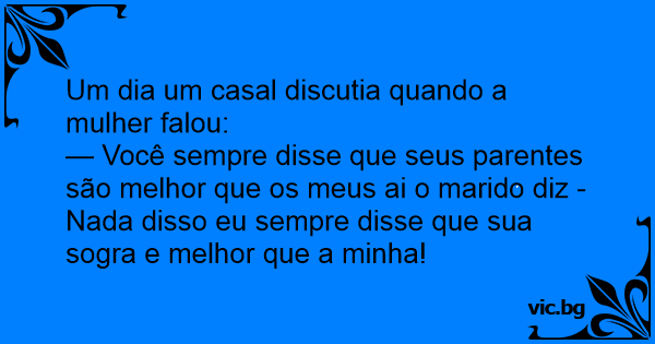 — Você sempre disse que seus parentes são melhor que os meus ai o marido diz -Nada disso eu sempre disse que sua sogra e melhor que a minha!