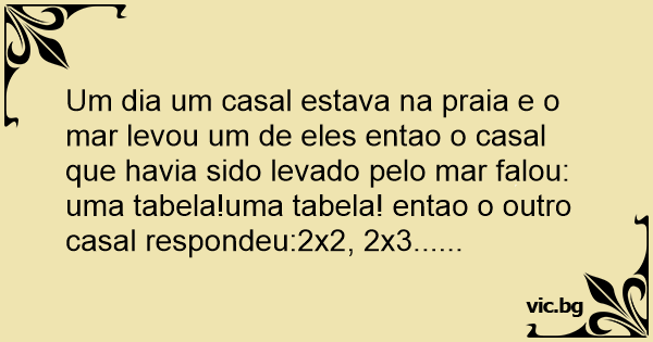 Um dia um casal estava na praia e o mar levou um de eles entao o casal que havia sido levado pelo mar falou: uma tabela!uma tabela! entao o outro casal respondeu:2x2, 2x3......