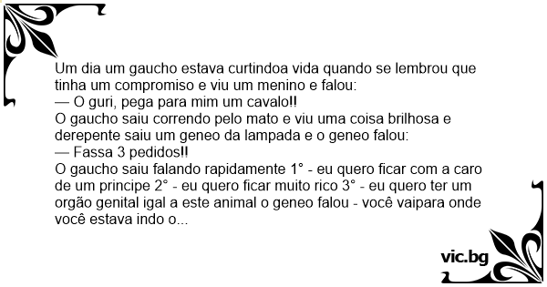 O gaucho saiu falando rapidamente 1° - eu quero ficar com a caro de um principe 2° - eu quero ficar muito rico 3° - eu quero ter um orgão genital igal a este animal o geneo falou - você vaipara onde você estava indo o gaucho chegou no baile e foi direto para o banheiro e foi ver se realizou os pedidos primeiro foi no espelho e estavo com o rosto do Marcio Garcia, depois botou a mão no bouso e tirou a mão cheia de dinheira e depois foi logo tirar as causas e viu uma racha bem gande.