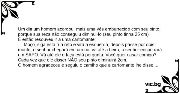 Um dia um homem acordou, mais uma vês emburrecido com seu pinto, porque sua reza não conseguiu diminui-lo (seu pinto tinha 25 cm).