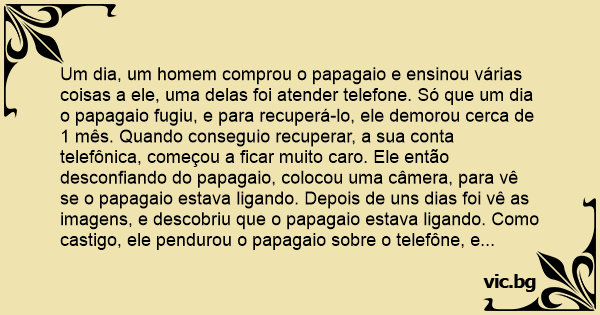 Um dia, um homem comprou o papagaio e ensinou várias coisas a ele, uma delas foi atender telefone. Só que um dia o papagaio fugiu, e para recuperá-lo, ele demorou cerca de 1 mês. Quando conseguio recuperar, a sua conta telefônica, começou a ficar muito caro. Ele então desconfiando do papagaio, colocou uma câmera, para vê se o papagaio estava ligando. Depois de uns dias foi vê as imagens, e descobriu que o papagaio estava ligando. Como castigo, ele pendurou o papagaio sobre o telefône, e disse: você vai ficar ai, até minha raiva acabar. Depois que ele saiu, o papagaio olhou para frente e viu uma cruz com Jesus, ai leu o que estava na cruz e disse: Inri,Inri, quando Jesus levantou a cabeça ele perguntou: tu, ta ai, há quanto tempo? Jesus respondeu: A milhões de anos.