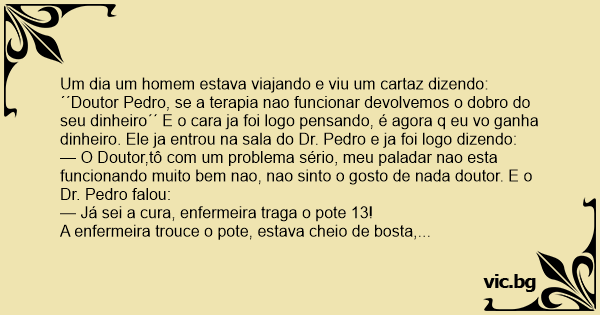´´Doutor Pedro, se a terapia nao funcionar devolvemos o dobro do seu dinheiro´´ E o cara ja foi logo pensando, é agora q eu vo ganha dinheiro. Ele ja entrou na sala do Dr. Pedro e ja foi logo dizendo: