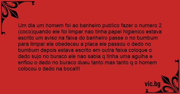 Um dia um homem foi ao banheiro publico fazer o numero 2 (coco)quando ele foi limpar nao tinha papel higienico estava escrito um aviso na faixa do banheiro passe o no bumbum para limpar ele obedeceu a placa ele passou o dedo no bumbum depois estava escrito em outra faixa coloque o dedo sujo no buraco ele nao sabia q tinha uma agulha e enfiou o dedo no buraco dueu tanto mas tanto q o homem colocou o dedo na boca!!!