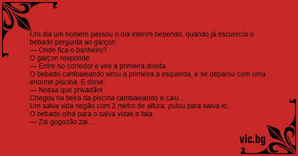 O bebado cambaleando virou a primeira a esquerda, e se deparou com uma enorme piscina. E disse: