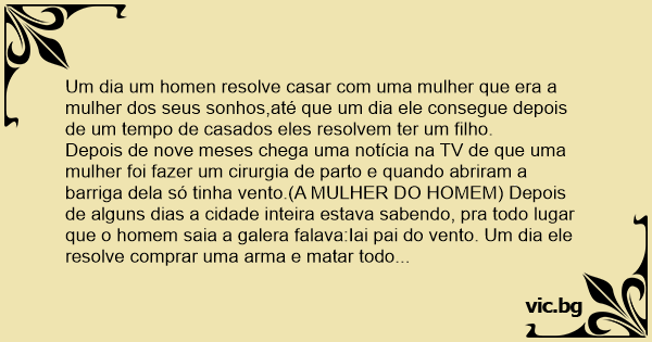 Depois de nove meses chega uma notícia na TV de que uma mulher foi fazer um cirurgia de parto e quando abriram a barriga dela só tinha vento.(A MULHER DO HOMEM) Depois de alguns dias a cidade inteira estava sabendo, pra todo lugar que o homem saia a galera falava:Iai pai do vento. Um dia ele resolve comprar uma arma e matar todo mundo que o chamasse de pai do vento. A mulher dele não concordou com a idéia e disse:Amor você não pode matar todas as pessoas que te chamarem de pai do vento,se não daqui apouco não vai ter mais ninguem na cidade.