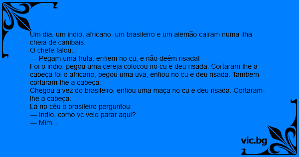 Foi o indio, pegou uma cereja colocou no cu e deu risada. Cortaram-lhe a cabeça foi o africano, pegou uma uva, enfiou no cu e deu risada. Tambem cortaram-lhe a cabeça.