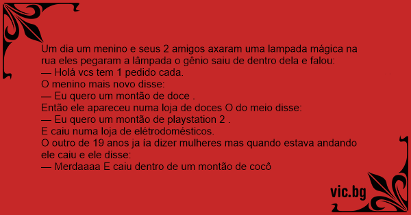 Um dia um menino e seus 2 amigos axaram uma lampada mágica na rua eles pegaram a lâmpada o gênio saiu de dentro dela e falou:
