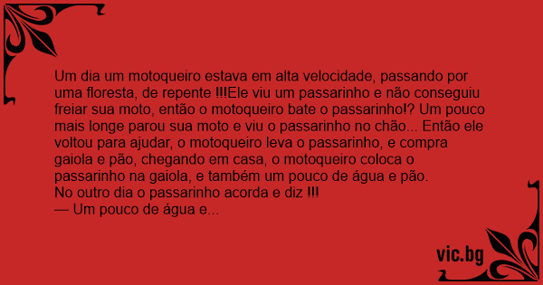 Um dia um motoqueiro estava em alta velocidade, passando por uma floresta, de repente !!!Ele viu um passarinho e não conseguiu freiar sua moto, então o motoqueiro bate o passarinho!? Um pouco mais longe parou sua moto e viu o passarinho no chão... Então ele voltou para ajudar, o motoqueiro leva o passarinho, e compra gaiola e pão, chegando em casa, o motoqueiro coloca o passarinho na gaiola, e também um pouco de água e pão.