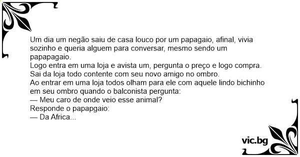 Um crioulo entra no bar com um papagaio no ombro e um grita ládo fundo; " Onde arrumou esse animal?" O papagaio respondeu: " Na África, tá cheio deles."