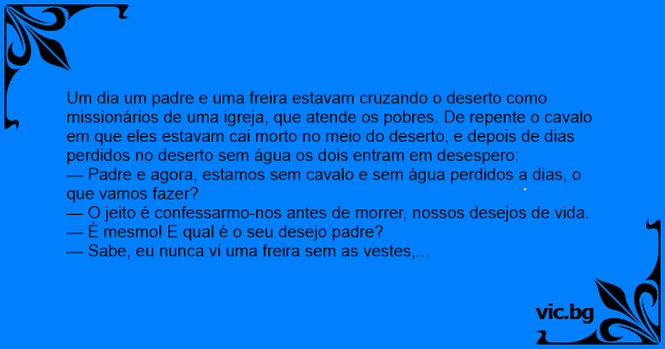 O padre e a freira estavam atravessando o deserto do Saara em cima de um camelo. De repente, o camelo começou a babar, mancar, se ajoelhou e morreu. O padre, sem vergonha, olhou pra freira gostosa...