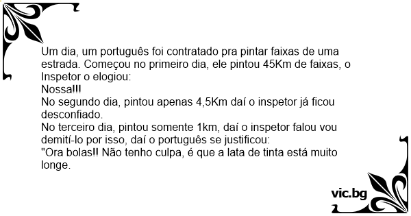 No terceiro dia, pintou somente 1km, daí o inspetor falou vou demití-lo por isso, daí o português se justificou:
