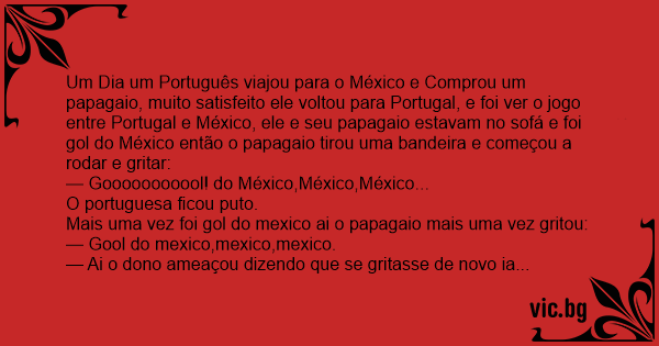 Um Dia um Português viajou para o México e Comprou um papagaio, muito satisfeito ele voltou para Portugal, e foi ver o jogo entre Portugal e México, ele e seu papagaio estavam no sofá e foi gol do México então o papagaio tirou uma bandeira e começou a rodar e gritar: