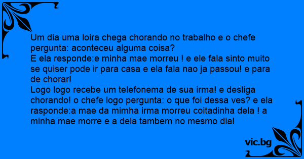 Logo logo recebe um telefonema de sua irma! e desliga chorando! o chefe logo pergunta: o que foi dessa ves? e ela rasponde:a mae da mimha irma morreu coitadinha dela ! a minha mae morre e a dela tambem no mesmo dia!