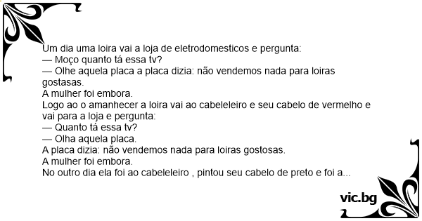 Um dia uma loira foi numa loja conprar uma televisao e pergunta para o comerciante: Quantovale essa tv???? O comerciante responde não vendemos!!! Ai a lora foi en casa e pintou o cabelo de ruivo...