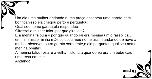 E a menina falou,a é por que quando eu era menina um girassol caiu em mim,nisso minha mãe colocou meu nome assim andando de novo a mulher observou outra garota sorridente,e ela perguntou,qual seu nome menina bonita?