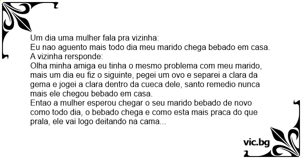 Ai a sua esposa pega o ovo e faz o que a sua amiga lhe aconselhou, pegou a clara e colocou por dentro da cueca do marido bebado.