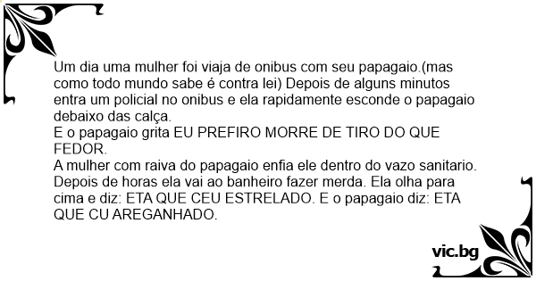 Depois de horas ela vai ao banheiro fazer меrdа. Ela olha para cima e diz: ETA QUE CEU ESTRELADO. E o papagaio diz: ETA QUE CU AREGANHADO.