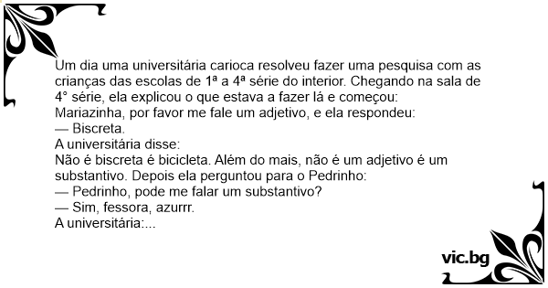 Um dia uma universitária carioca resolveu fazer uma pesquisa com as crianças das escolas de 1ª a 4ª série do interior. Chegando na sala de 4° série, ela explicou o que estava a fazer lá e começou: Mariazinha, por favor me fale um adjetivo, e ela respondeu: — Biscreta. A universitária disse: Não é biscreta é bicicleta. Além do mais, não é um adjetivo é um substantivo. Depois ela perguntou para o Pedrinho: — Pedrinho, pode me falar um substantivo? — Sim, fessora, azurrr. A universitária: — Não é azurrr é azul. Além do mais não é substantivo é adjetivo. Então, a universitária, já impaciente, vira para joãozinho e pergunta: — Joãozinho, pode me dizer um verbo? Joãozinho responde: — Hospedar. A universitária: — Muito bem, você acertou. E então a universitária, entusiasmada completa: — Joãozinho, já que foi o único que acertou, diga para a turma uma frase com o verbo hospedar. Joãozinho: — Ta bem, fessora: Ospedar da biscreta é azurrr.