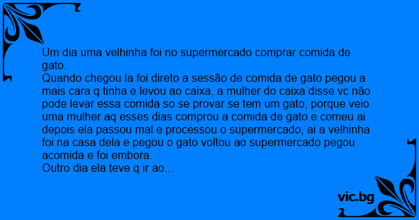 Quando chegou la foi direto a sessão de comida de gato pegou a mais cara q tinha e levou ao caixa, a mulher do caixa disse vc não pode levar essa comida so se provar se tem um gato, porque veio uma mulher aq esses dias comprou a comida de gato e comeu ai depois ela passou mal e processou o supermercado, ai a velhinha foi na casa dela e pegou o gato voltou ao supermercado pegou acomida e foi embora.