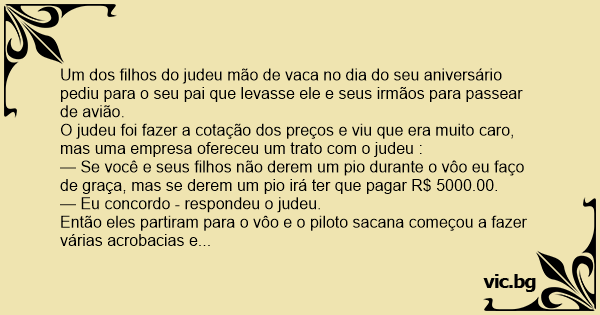 Um dos filhos do judeu mão de vаса no dia do seu aniversário pediu para o seu pai que levasse ele e seus irmãos para passear de avião.