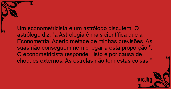 Um econometricista e um astrólogo discutem. O astrólogo diz, “a Astrologia é mais científica que a Econometria. Acerto metade de minhas previsões. As suas não conseguem nem chegar a esta proporção.”.
