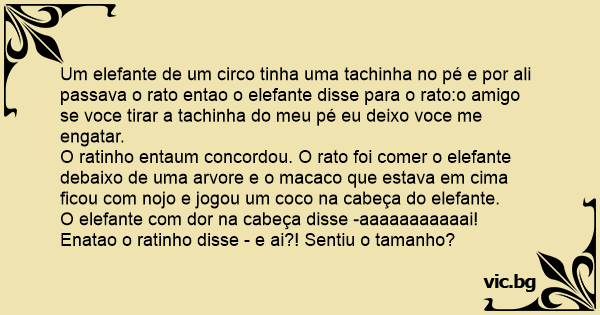 Um elefante de um circo tinha uma tachinha no pé e por ali passava o rato entao o elefante disse para o rato:o amigo se voce tirar a tachinha do meu pé eu deixo voce me engatar.