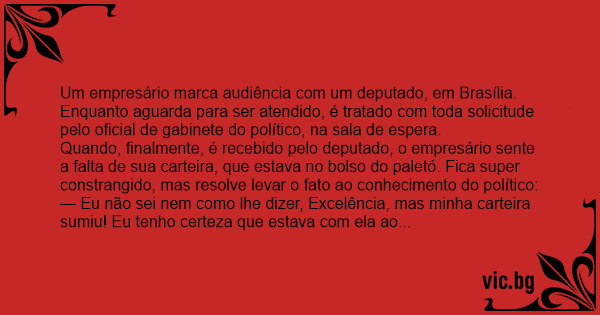 Quando, finalmente, é recebido pelo deputado, o empresário sente a falta de sua carteira, que estava no bolso do paletó. Fiса super constrangido, mas resolve levar o fato ao conhecimento do político: