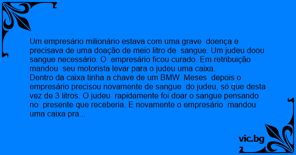 Mas, para a sua surpresa, ele abriu a caixa e tinha três esfihas. O judeu ficou p... da vida e foi tirar satisfação. "Pô, meu amigo, eu não estou entendendo. Eu lhe doei meio litro de sangue e ganhei uma BMW e quando doei três litros você me deu três esfihas!!!" E o empresário disse: