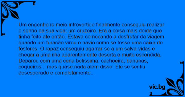 * Mas não é água de coco! Eu tenho um alambique meio rudimentar lá fora, de forma que podemos tomar Pinas-coladas autênticas! Tentando esconder a surpresa, o engenheiro aceitou. Sentaram no sofá dela para conversar. Depois de contarem suas histórias, a moca perguntou: