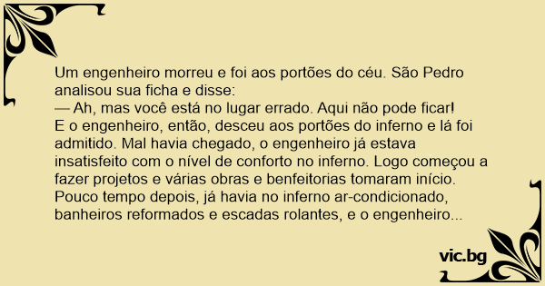 E o engenheiro, então, desceu aos portões do inferno e lá foi admitido. Mal havia chegado, o engenheiro já estava insatisfeito com o nível de conforto no inferno. Logo começou a fazer projetos e várias obras e benfeitorias tomaram início. Pouco tempo depois, já havia no inferno ar-condicionado, banheiros reformados e escadas rolantes, e o engenheiro era um cara muito popular por lá.