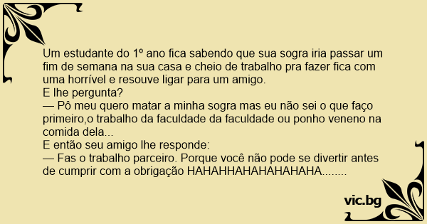 — Pô meu quero matar a minha sogra mas eu não sei o que faço primeiro,o trabalho da faculdade da faculdade ou ponho veneno na comida dela...