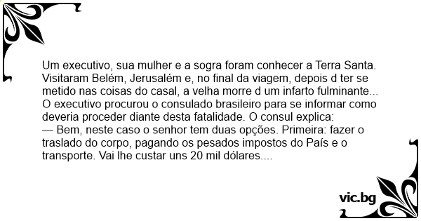 — Bem, neste caso o senhor tem duas opções. Primeira: fazer o traslado do corpo, pagando os pesados impostos do País e o transporte. Vai lhe custar uns 20 mil dólares. A segunda é enterrá-la aqui mesmo, o que custará uns 500 dólares.
