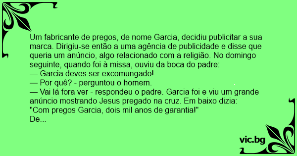 Um fabricante de pregos, de nome Garcia, decidiu publicitar a sua marca. Dirigiu-se então a uma agência de publicidade e disse que queria um anúncio, algo relacionado com a religião. No domingo seguinte, quando foi à missa, ouviu da boca do padre:
