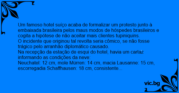 Um famoso hotel suíço acaba de formalizar um protesto junto à embaixada brasileira pelos maus modos de hóspedes brasileiros e cogita a hipótese de não aceitar mais clientes tupiniquins.
