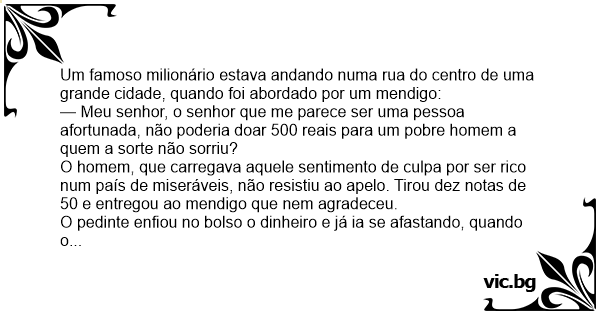 — Meu senhor, o senhor que me parece ser uma pessoa afortunada, não poderia doar 500 reais para um pobre homem a quem a sorte não sorriu?