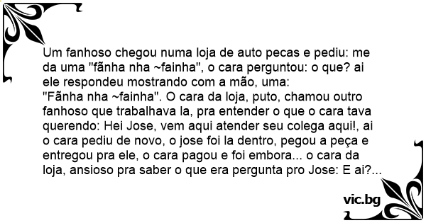 "Fãnha nha ~fainha". O cara da loja, рuто, chamou outro fanhoso que trabalhava la, pra entender o que o cara tava querendo: Hei Jose, vem aqui atender seu colega aqui!, ai o cara pediu de novo, o jose foi la dentro, pegou a peça e entregou pra ele, o cara pagou e foi embora... o cara da loja, ansioso pra saber o que era pergunta pro Jose: E ai? o que o cara queria? ai o Jose responde: uma "fãnha nha ~fainha"! he he...