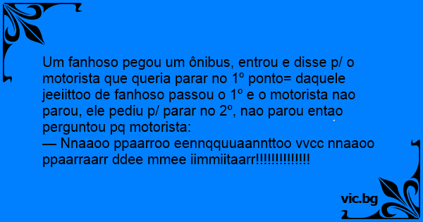 Um fanhoso pegou um ônibus, entrou e disse p/ o motorista que queria parar no 1º ponto= daquele jeeiittoo de fanhoso passou o 1º e o motorista nao parou, ele pediu p/ parar no 2º, nao parou entao perguntou pq motorista: