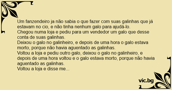 Voltou a loja e disse me dá um galo macho, o vendedor pegou um galo velho, com as penas caindo, magrelo, todo feio, deixou-o no galinheiro, voltou depois de uma hоrа e todas as suas galinhas estavam mortas e o galo havia sumido, abriu um sorriso e grande disse: esse galo é bom, mas cade ele?